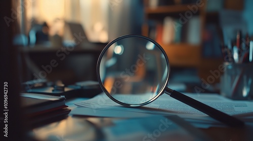 Close-up of magnifying glass over analytical charts in office workspace with scattered pens