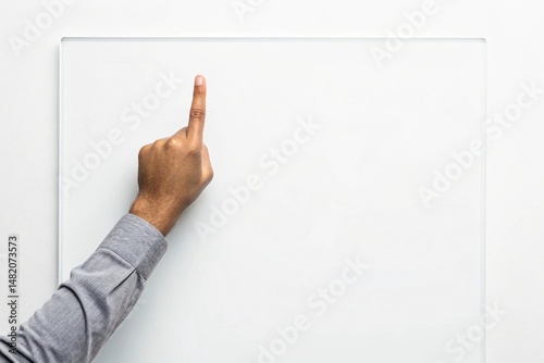 Close-up of male hand pointing at blank whiteboard on white background
