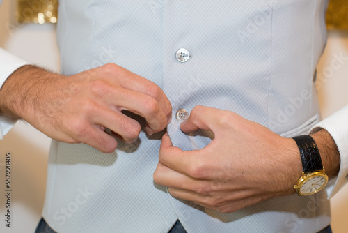 Close-up of man wearing a suit and a watch. A man buttoning his jacket. Light colors and light blur. Details of the hands in close-up.