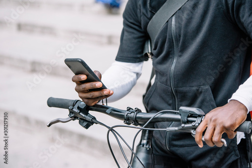 Close-up of man with bicycle using smartphone