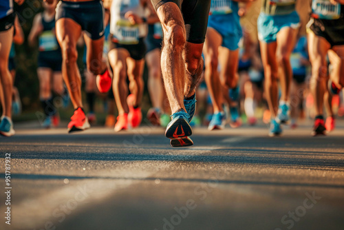 Close-Up of Marathon Runners on City Road. Concept of Athletic Competition and Endurance. Runners on race track. Generative AI