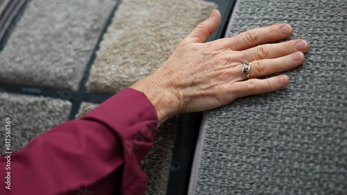 Closeup of mature womans hand moving across carpet or rug samples in a hardware store.