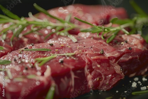 Close-up of meat on a plate with rosemary sprigs, ideal for food-related projects
