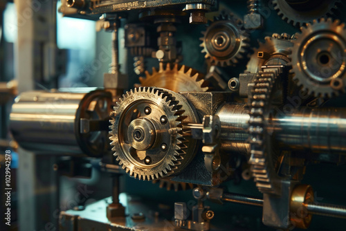 Close-up of mechanical gears and components, intricate engineering design metallic textures workshop environment