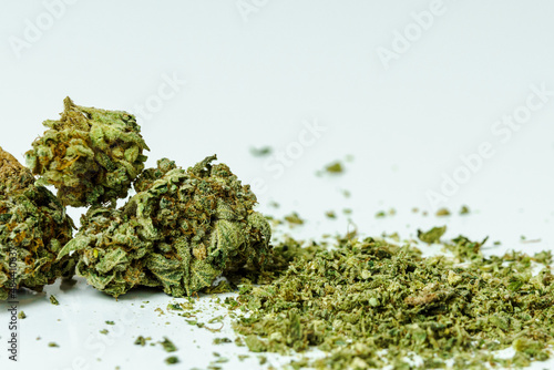 Close-up of medical marijuana buds on white background. Concept of herbal and alternative medicine