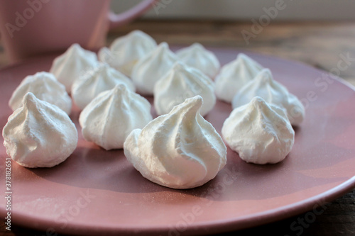 Close-up of meringue on a pink plate. Marshmallows on pink background
