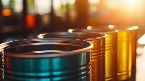 Closeup of metal tin paint cans filled with vibrant colors symbolizing creativity, artistic expression, and transformation in design. Represents renewal, home improvement, and modern aesthetics