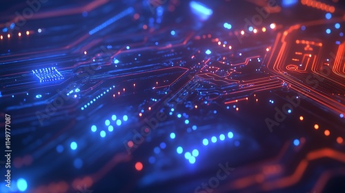 Close-up of microchip circuits with glowing red and blue neon lights, symbolizing technology