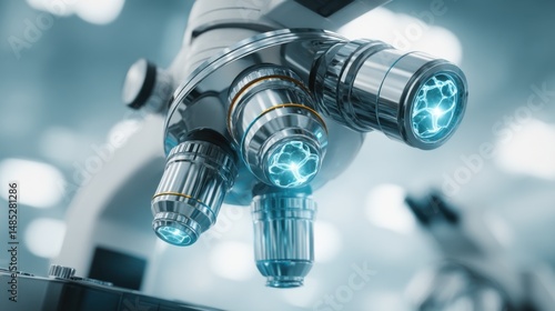 Close-up of Microscope Lenses with Blue Light for Scientific Research and Medical Analysis in Laboratory Setting