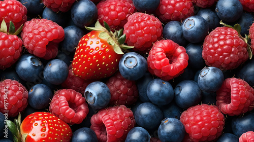 Close-up of mixed fresh berries including strawberries, raspberries, and blueberries arranged together.