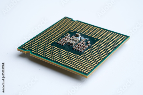Close-up of modern CPU Chip Processor for tech science background. Selective Focus.