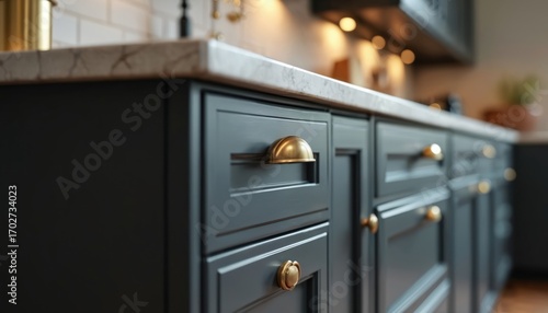 Close-up of modern dark gray kitchen cabinets with golden knobs. Stylish design with accent detail. Interior home decor with wooden counter top. Contemporary furniture detail. Soft lighting creates