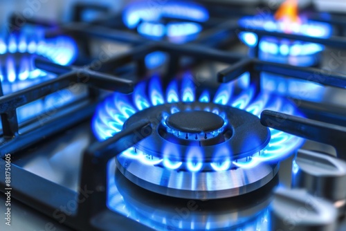 Closeup of modern gas stove burning blue flames on kitchen