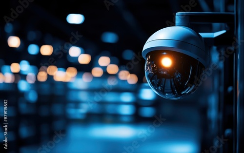 Close-up of modern surveillance camera in a dimly lit environment, capturing security technology in action.
