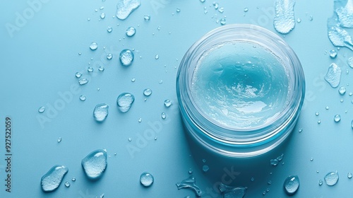 Close-up of moisturizer and hyaluronic acid serum with water droplets on a blue background. Ideal for skincare ads and product presentations.