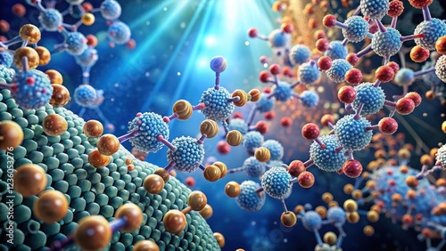 Close-up of molecules interacting with cell membranes and lipids, cell membrane, metabolism, cell membrane