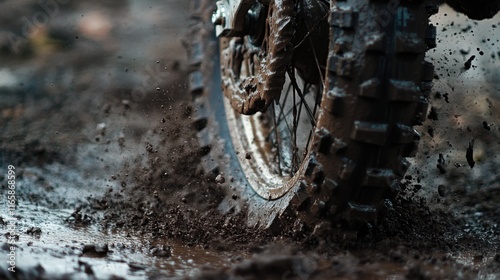 Close-Up of Motocross Bike Tire Spinning in Mud