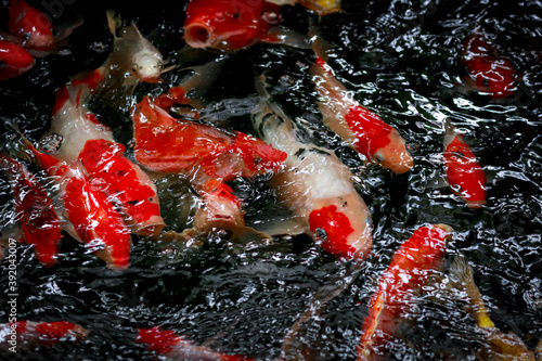 Close-up of mottled black, white, red, orange & golden yellow Jinli, Nishikigoi or Japanese Koi (Cyprinus rubrofuscus) fish swim against the current in a fresh-water pond, w/ reflective surface light.