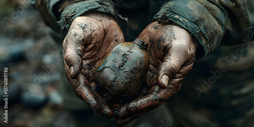 Close-up of Mud-Covered Hands Holding an Old Grenade, a Symbol of Conflict and Wartime Hardships