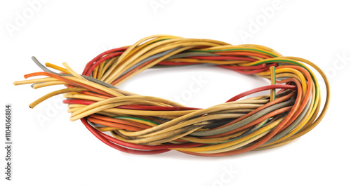 Close-up of multi-wire cables bundle plaited to circle isolated on white background. Colored wiring assembly of copper conductors with plastic insulation.