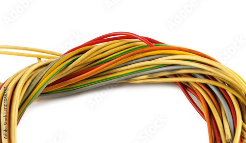 Close-up of multi-wire cables bundle plaited to circle on white background. Colored wiring of copper conductors with plastic insulation.