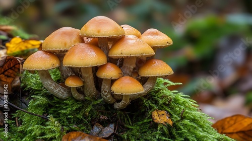 CloseUp of Mushrooms on Mossy Forest Floor in Autumn Nature Setting : Generative AI