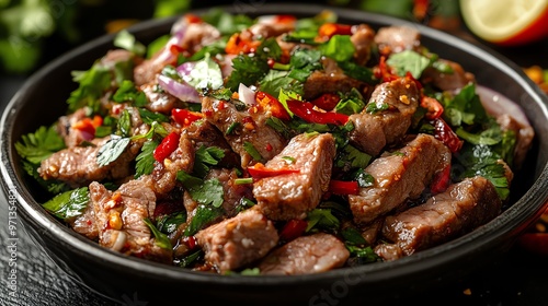 Closeup of Nam Tok grilled meat salad with fresh herbs, chili, and lime, Nam Tok, Isaan spicy dish