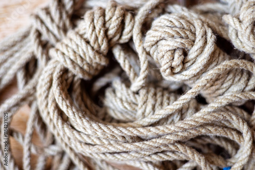 Close-up of natural hemp ropes, neatly coiled and designed for artistic and secure bondage, showcasing their texture and organic material.