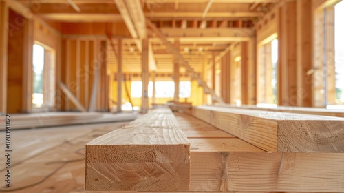 Close-up of natural wood beams in a new home under construction, stacked in rows with blurred background, highlighting the unfinished interior