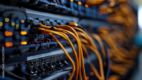 Close-up of network server cables in data center with blurred background