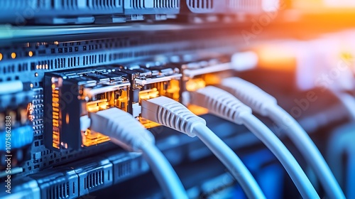 Close-up of network switches with Ethernet cables connected, showcasing technology infrastructure.