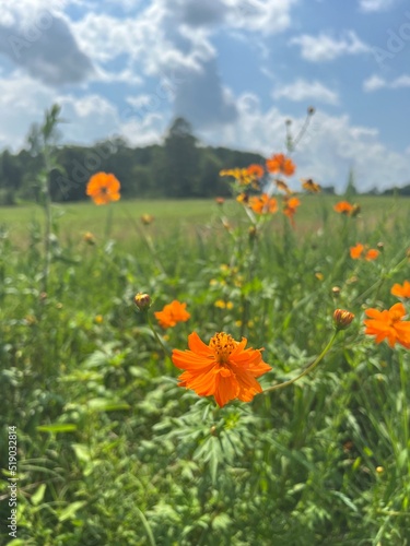 Close-Up of Orange Wildflower Cosmos in a Meadow of Grass with Blue Sky and White Clouds in Background
