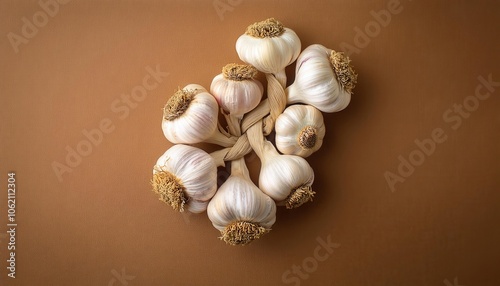 Close-Up of Organic Garlic Bulbs in a Circular Wreath Formation on a Warm Beige Background. Ideal for Culinary, Health, Harvest, and Seasonal Concepts Highlighting Natural and Rustic Kitchen Ingredie