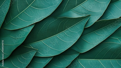 Close-up of overlapping detailed green leaves with visible intricate vein patterns creating a natural texture and organic background
