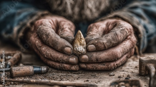 Close-up of Paleontologist's Hands Holding a Fossilized Tooth