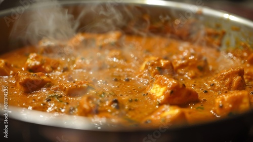 Close-up of paneer butter masala simmering in a creamy tomato gravy, exuding rich aroma and inviting viewers to indulge in its decadent flavors.
