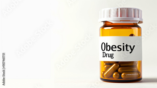 Close-up of partially opened prescription pill bottle labeled "Obesity Drug" with visible pills inside, symbolizing the start of a weight management treatment journey on a clean white background.