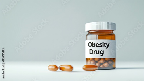Close-up of partially opened prescription pill bottle labeled "Obesity Drug" with visible pills inside, symbolizing the start of a weight management treatment journey on a clean white background.