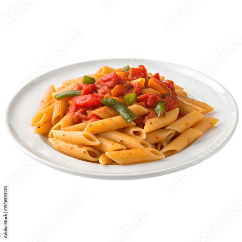Close-up of penne pasta with tomato sauce and vegetables on a white plate
