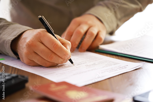 Close-Up of Person Filling Out Forms with Passport and Pen on Table