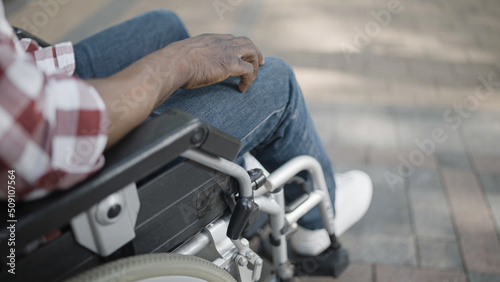 Close-up of person sitting in wheelchair in a park, rehabilitation after injury