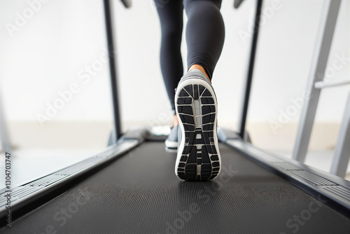 Close-up of person's legs walking on treadmill or walk pad n fitness gym.