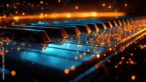 Close-up of piano keys illuminated by glowing particles, creating a vibrant musical atmosphere