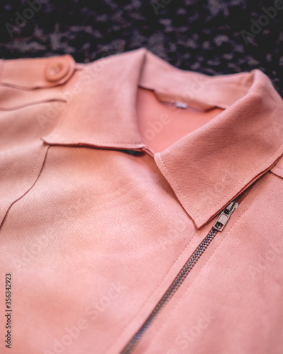 Close-up of pink eco leather jacket over black hairy background