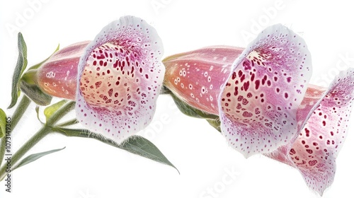 Close-up of pink foxglove flowers with detailed patterns on white background