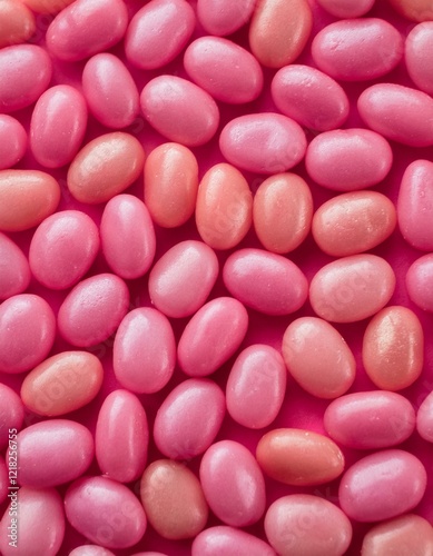 Close-up of pink jelly beans scattered on a pink background. Sweet and colorful candy.