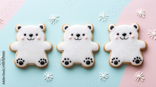 Close-up of polar bear-shaped cookies decorated with white icing and black candy eyes, set on a colorful background, creative treats for kids, fun and playful vibe