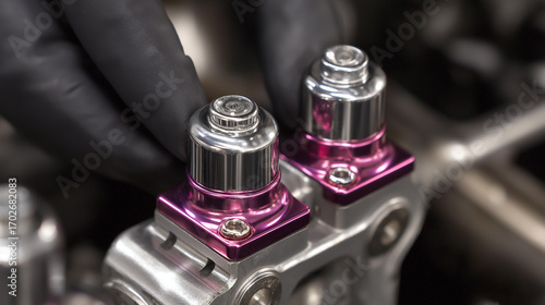 Close-up of polished chrome battery terminals being tightened under bright light.