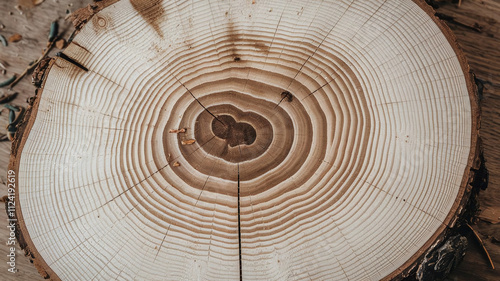 Close-up of Poplar tree cut surface featuring detailed tree rings, cracks, and a smooth grain pattern, ideal for backgrounds, natural designs, and woodworking material references.