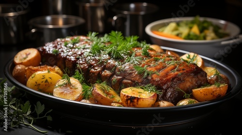 Close-up of pot roast, delicious textures captured, front view from above, studio lighting, white background.